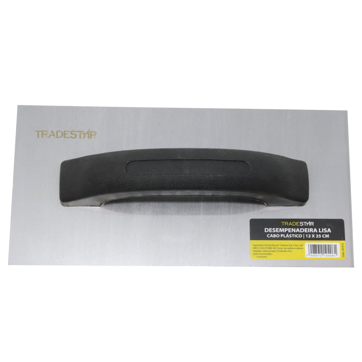 Desempenadeira Aço Lisa 12x25Cm Cabo Lisa Cabo Plástico Tradestar utilizada para construção e acabamento de superfícies de reboco e argamassa. Com Espátula retangular e uma lâmina de aço plana e lisa na parte inferior, que é usada para aplicar, nivelar e alisar materiais como argamassa, reboco, gesso e outros revestimentos em paredes, tetos e pisos.