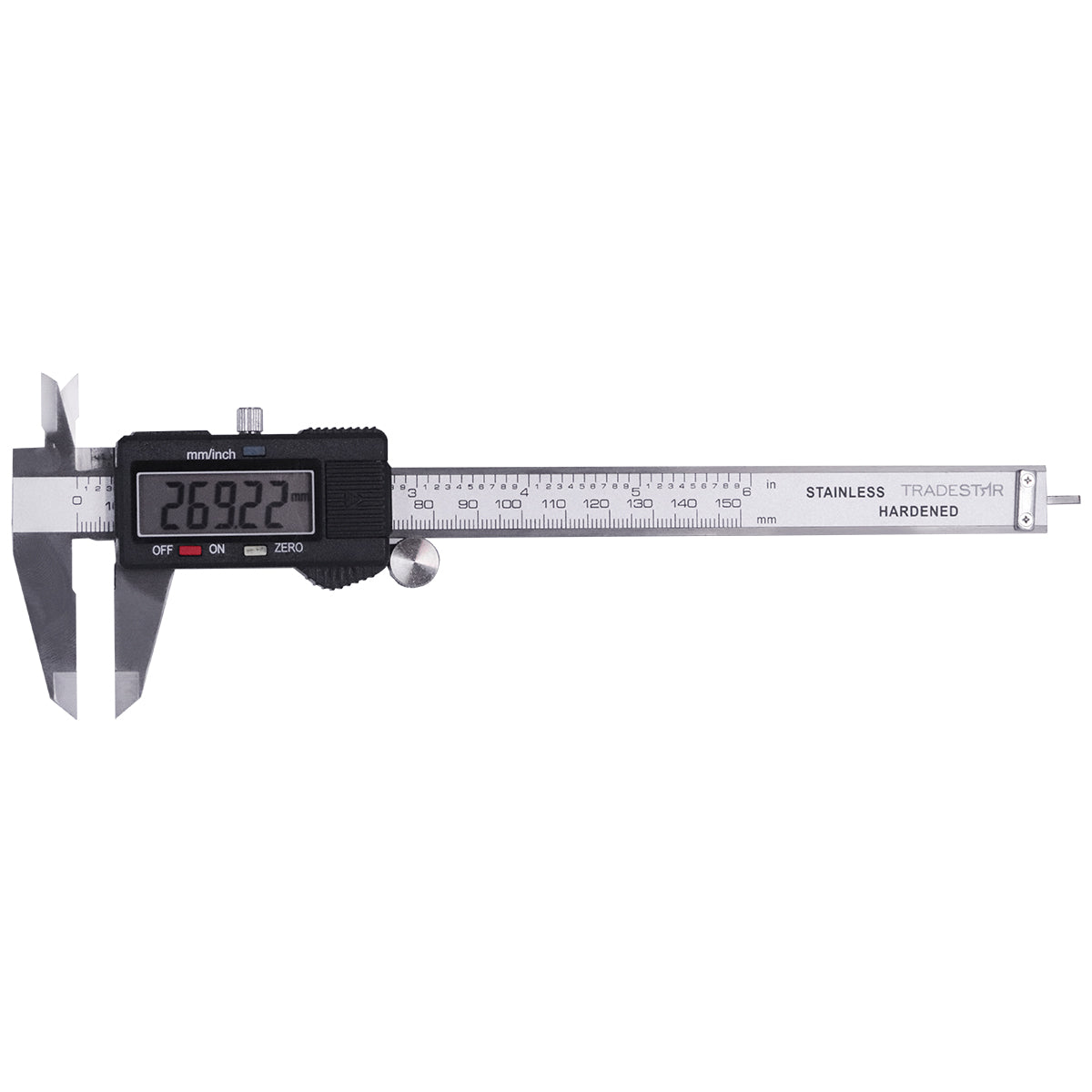 Paquímetro Digital 150mm Pro em Inox Tradestar, ferramenta de medição de alta precisão com display digital para medições internas, externas, profundidade e ressaltos. Ideal para mecânicos, engenheiros e profissionais de usinagem. Paquímetro digital em aço inoxidável, com escala em mm e polegadas, visor digital e botões de controle.
